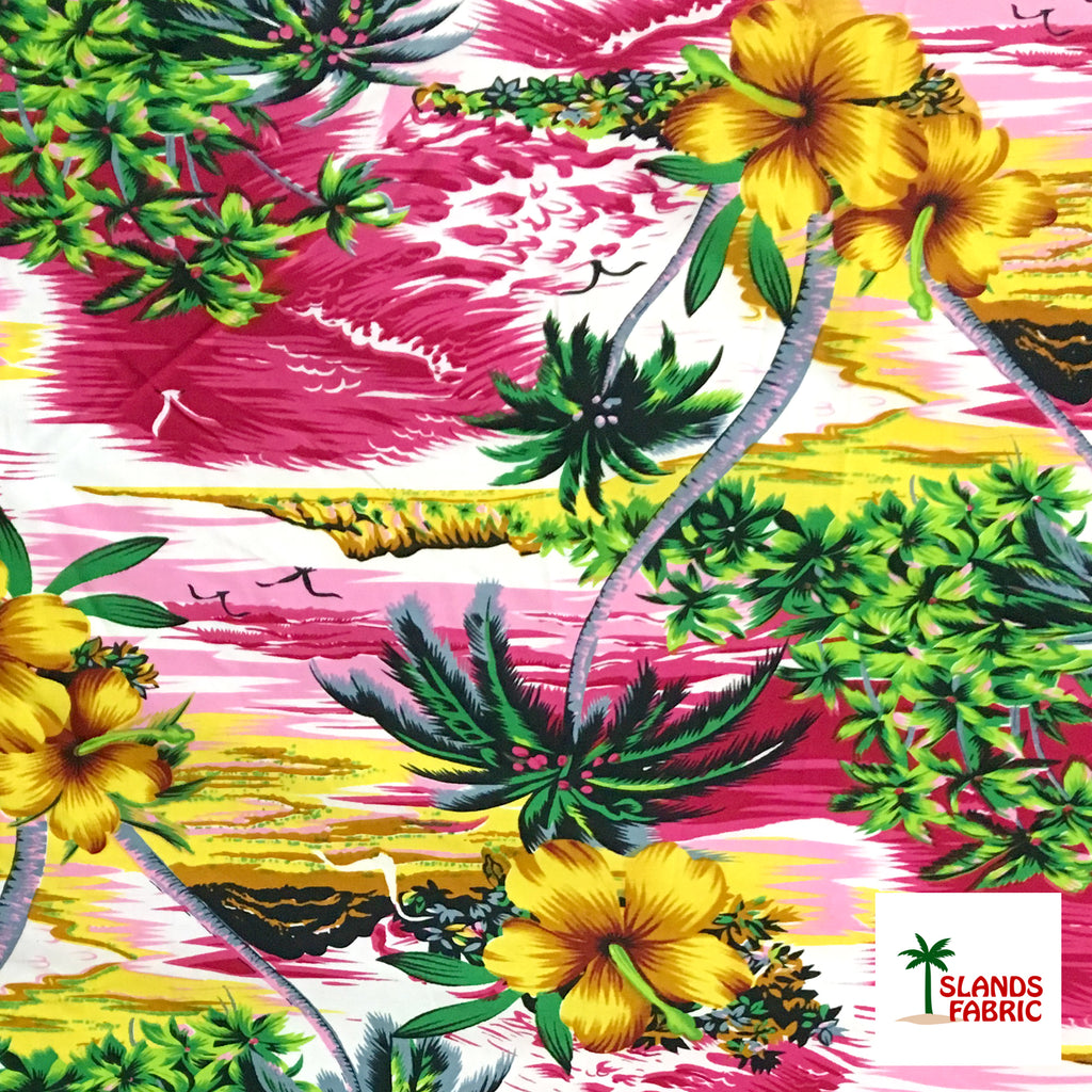 Experience the tropical paradise with our Hibiscus Hawaiian Sunset! Made from luxurious peachskin fabric, it features islands, palm trees, hibiscus flowers, seagulls, and waves, bringing the beauty of the beach to your wardrobe. Soft and lightweight, it will keep you comfortable while making a statement.